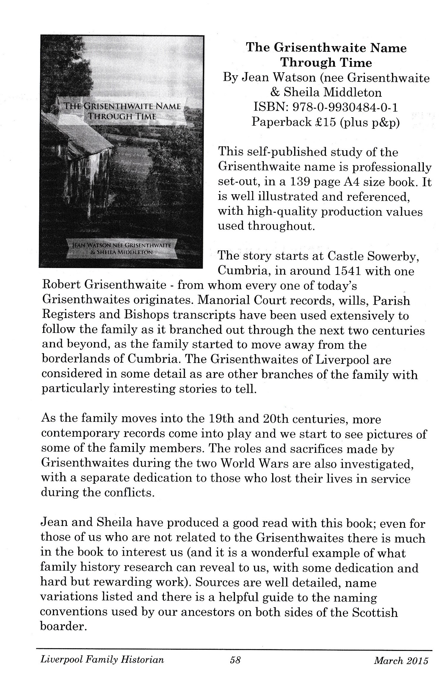 Book Review by the Liverpool SW Family History Society in March of 2015 |